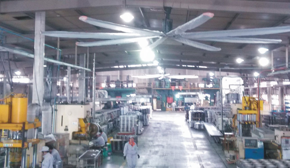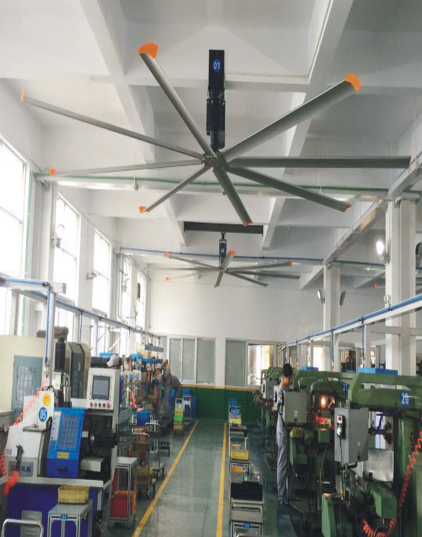 我公司生產的大型工業吊扇直接懸掛在廠房屋梁下,風力柔和,能加快車間空氣流通,有效降低車間內溫度,改善車間空氣環境質量,有利于員工的身體健康。
